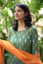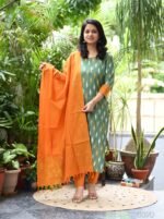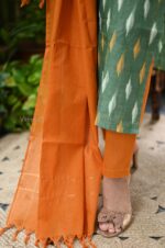 A sophisticated and traditional ensemble featuring a ikkat green kurta, complemented by a vibrant orange rust dupatta and matching same colour south cotton pant. The attire is an exquisite blend of cultural richness and contemporary style.