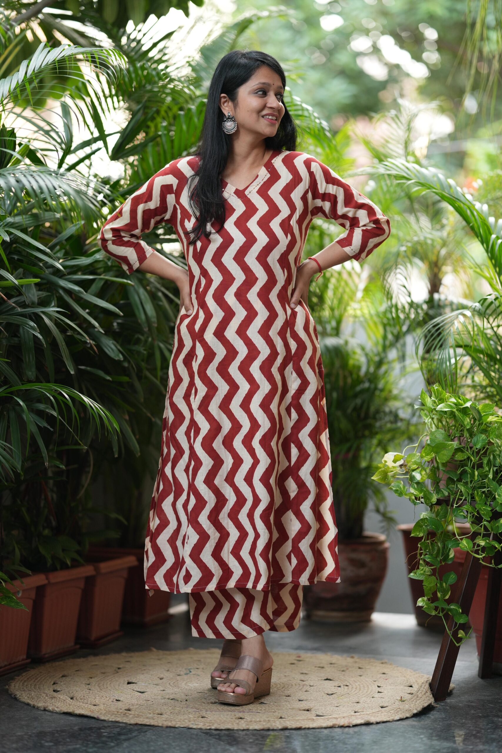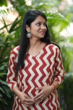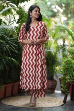 Pure cotton breathable and soft…. Very chic and trending print… A line kurta with two pockets and minimal neck detailing…paired with matching pants…
