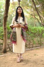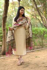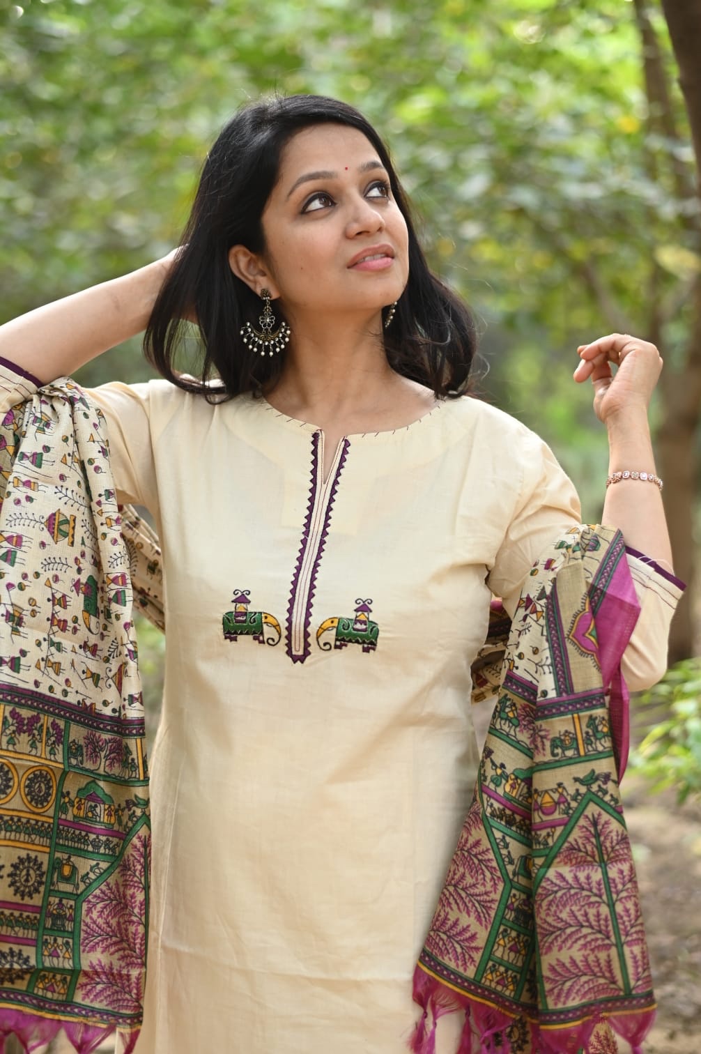 Cotton cream veg kurta adorned with zari elephant motifs…with pant and warli print khadi silk dupatta