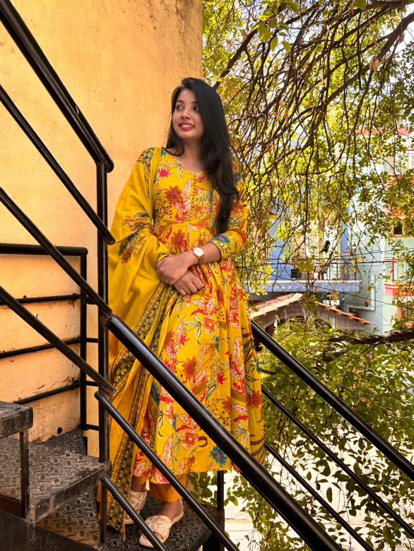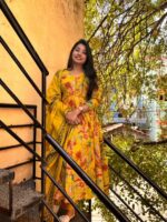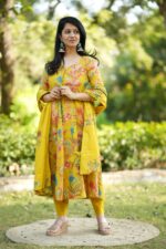 Step into elegance with this lightweight and flowy Anarkali, adorned with vibrant floral patterns. Complemented by a handlook mul dupatta, this outfit blends tradition with contemporary charm, perfect for festive occasions, weddings and casual outings.