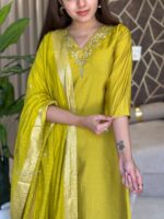Beautiful silk kurta(attached lining)and pant. Hand work embroidery on kurta Paired with jaqurad chanderi self zari duppata